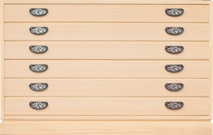 総桐100%の6段引き出しタンスです。「本格的なサイズの桐タンスはちょっと…」というお客様におすすめです。「お嫁入りの際に仕立てた、大切なお着物」「成人式でお召しになったお振り袖」「お子さまの七五三にご用意され記念のお着物」など、段数は少なめでOKというみなさまに、ピッタリの段数をご用意いたしました。![]()