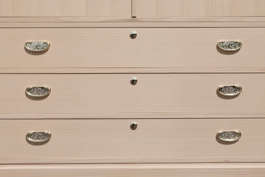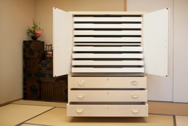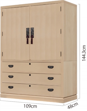 箪笥本体の胴厚を全て38ミリの無垢板で仕上げた、重厚感のある造りです。各引き出しの間には、全て棚板を奥まではめ込み、丈夫でしっかりとした造りになっております。全ての大引き出しに、カギが付きますので安心です。扉の中は盆が八段入っています。奥行を広くしていますので、引き出しの中にゆったりと衣類を収納できます。通常の和箪笥より少し高さを抑え、使いやすくしています。![]()